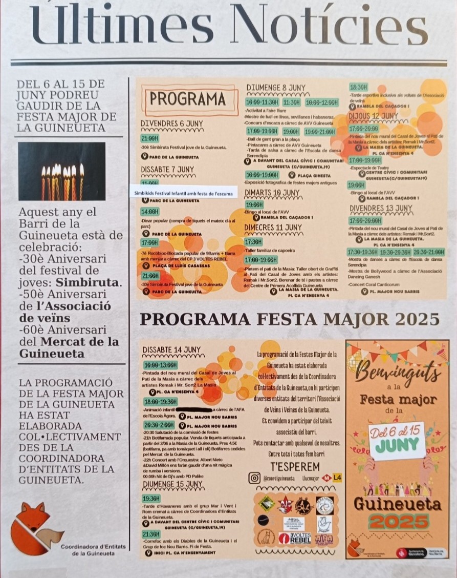 Del 6 al 15 de juny https://noubarris.info/guineueta/2025/06/festa-major-de-la-guineueta/ |