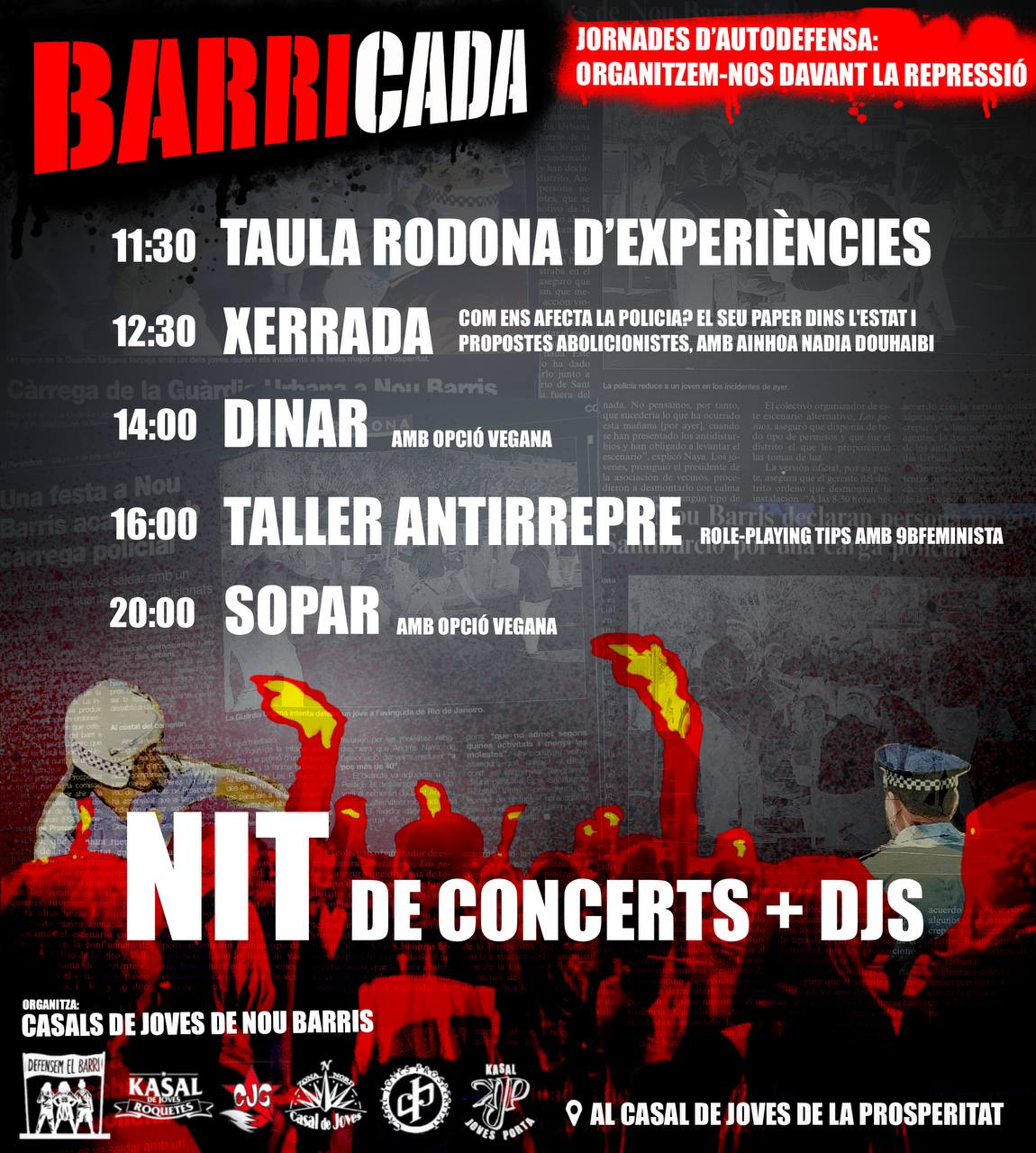 11:30h • Taula Rodona d’Experiències 12:30h • XERRADA: Com ens afecta la policia? El seu paper dins l’estat i propostes abolicionistes, amb Ainhoa Nadia Douhaibi 14:00h • DINAR amb opció vegana 16:00h • Taller antirrepre, roll-playing amb 9bfeminista 20:00h • SOPAR amb opció vegana Per la nit hi haurà concerts amb Punktakana, Timpada, La risa …