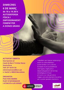 Treballem per trencar estereotips sobre la nostra feblesa i vulnerabilitat com a dones. Es tracta d’una autodefensa intel·ligent , implicant el desenvolupament de formes estratègiques d’usar el nostre cos i de percebre l’espai, així com mantenir la calma per a poder prendre decisions.