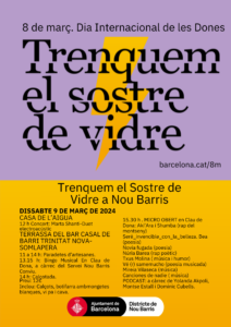 Inici/Esdeveniment/Espectacles/TRENQUEM EL SOSTRE DE VIDRE – 8M DIA INTERNACIONAL DE LES DONES – Concert, Bingo Musical, calçotada, paradetes d’artesania, pòdcast, micro obert TRENQUEM EL SOSTRE DE VIDRE – 8M DIA INTERNACIONAL DE LES DONES – Concert, Bingo Musical, calçotada, paradetes d’artesania, pòdcast, micro obert Informació de l'esdeveniment Data: 9 març 2024 Hora: 11:00 - 19:00 Categories d'Esdeveniment: Espectacles, Literatura, Música, Reivindicacions, Xerrades Lloc web: https://www.google.com/maps/place/Casal+de+Barri+Trinitat+Nova+-+SomLaPera/@41.4526513,2.1849076,17z/data=!3m1!4b1!4m6!3m5!1s0x12a4bd532b3e13fd:0x37a9118a5c4507a3!8m2!3d41.4526513!4d2.1874825!16s%2Fg%2F11gjhf9fbm?entry=ttu Ubicació esdeveniment Casal de Barri de Trinitat Nova – Som la Pera Carrer de Garbí 3 Barcelona, Barcelona 08033 Espanya + Mapa de Google Contacte 677408154 https://www.barcelona.cat/casalsdebarri/trinitat-nova/ Organització esdeveniment Casal de Barri Trinitat Nova – SomLaPera Telèfon 677 40 81 54