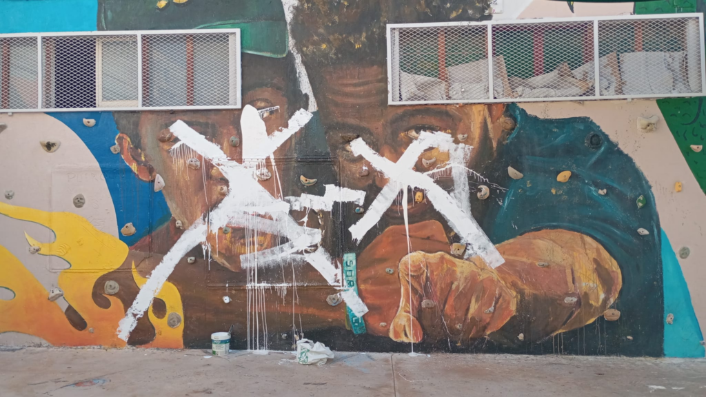 La nostra sorpresa ha sigut quan, la matinada del 18 de febrer, ens hem trobat que un dels murals ha estat vandalitzat amb pintura blanca. L’objecte de l’atac ha sigut concret: dues de les persones racialitzades que es representen al mural.