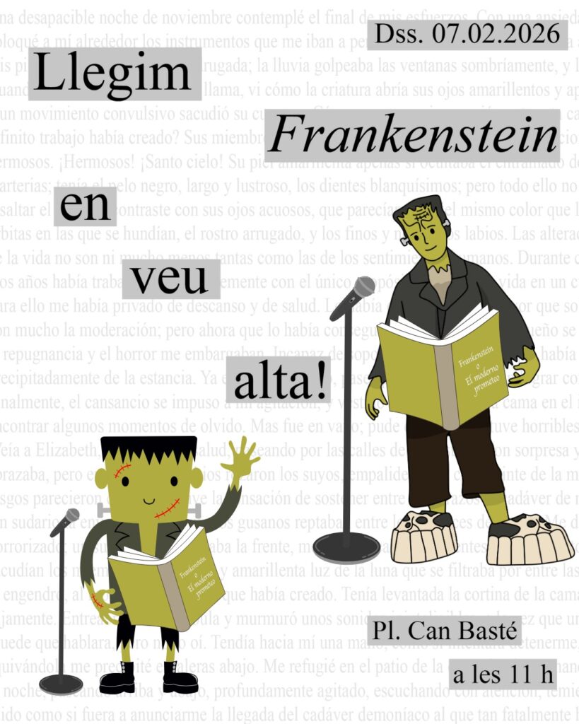 Amb aquesta activitat volem commemorar dues dates importants per a nosaltres: el Dia internacional de la lectura en veu alta i la commemoració de la mort de Mary Shelley, que va morir un 1 de febrer de 1851.