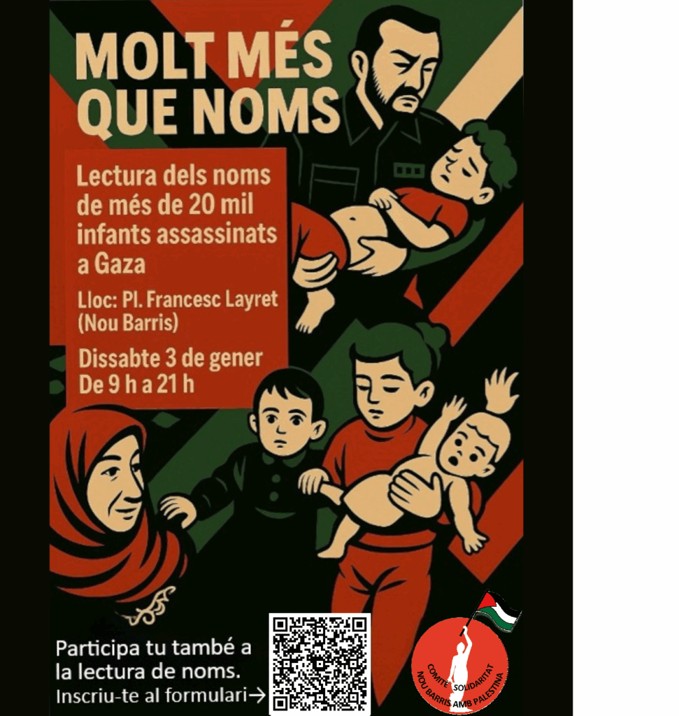 Des del Comitè de Solidaritat de Nou Barris amb Palestina posem en marxa una iniciativa a Nou Barris però que no és només de Nou Barris; MOLT MÉS QUE NOMS és una acció per a totes aquelles persones que vulguin denunciar públicament els assassinats comesos per Israel i en especial dels infants caiguts sota les bombes o per la fam i la manca de serveis sanitaris.